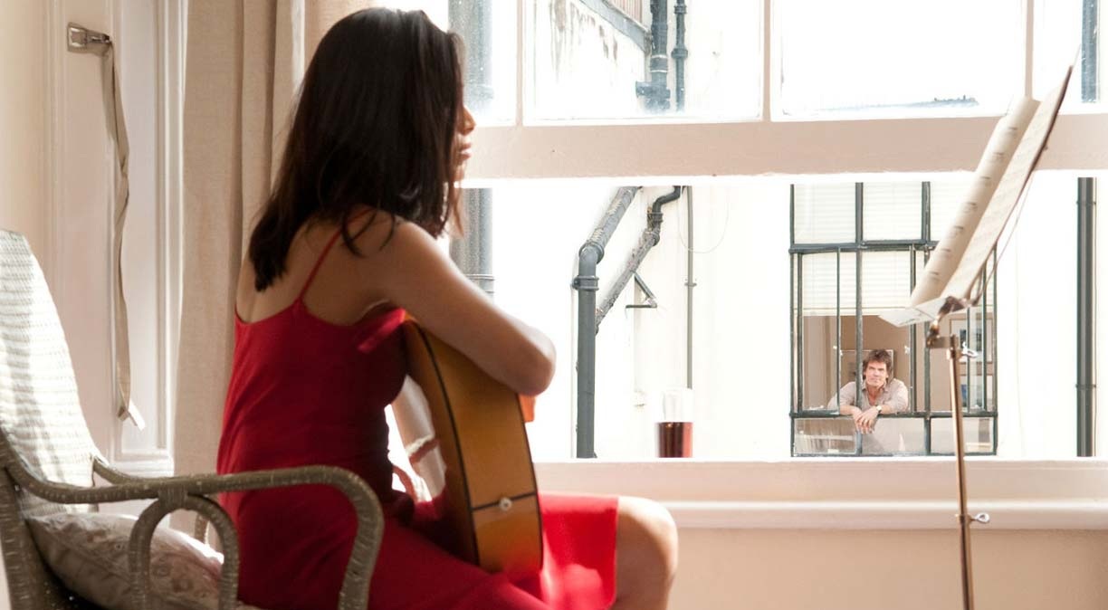 Roy d’altro canto eterno insoddisfatto scopre di avere una seducente dirimpettaia, Dia (Freida Pinto), la donna vestita di rosso che diventa la sua fantasia erotica.